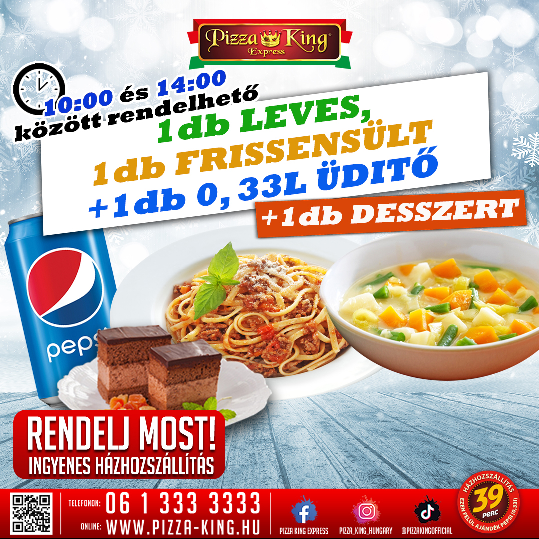 (Válaszd ki menüdet az alábbi listából! 1db leves, 1db frissensült és 1db 0, 33l üdítő, 1 db desszert)